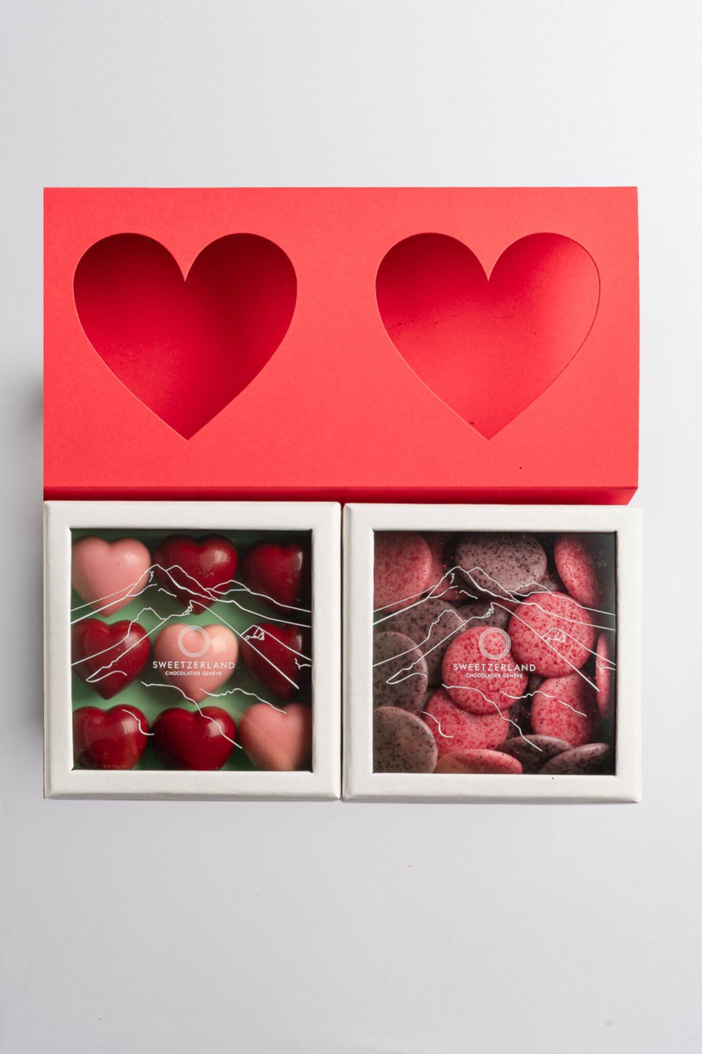💗 A mini Sweet Hearts box (9 pieces), hearts in naturally red and pink hues, filled with vanilla ganache and strawberry gianduja.